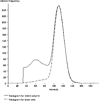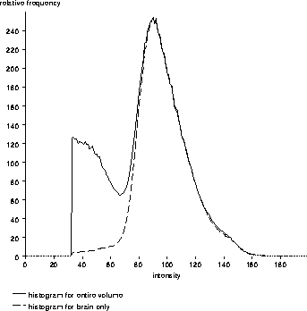 histogram overlaid. The intensities of the brain voxels are not quite