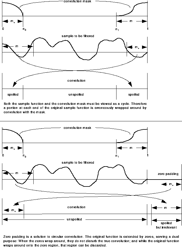 This wrapping, illustrated in one dimension in Figure 6.3 (see Numerical Recipes in C, p.541 [42]), is a property of spectral domain filtering. It can be avoided by padding the original image with zeros at its boundaries to compensate for the mask size, then discarding the padded region after filtering. Although this solution sounds simple, it increases the size of the image to be processed and results in undesirable FFT sizes.