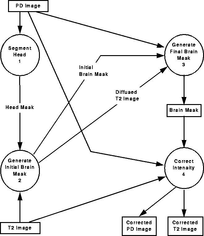 The method assumes that PD-weighted and a T2-weighted MRI data sets have been simultaneously acquired. Using histogram analysis of the PD-weighted data set, the first step, Segment Head, isolates the area within the head and provides a head mask defining that region. The second step, Generate Initial Brain Mask, produces a mask that approximately identifies the intracranial boundary. It uses nonlinear anisotropic diffusion of the T2-weighted data set and spatial information provided by the head mask to remove regions outside the brain. With the initial brain mask as a seed, the third step, Generate Final Brain Mask, locates the intracranial boundary using an active contour model algorithm. Finally, the Correct Intensity step reduces intensity variation (due to RF inhomogeneity) within the detected intracranial boundary by homomorphic filtering the MR volume under the final brain masks.