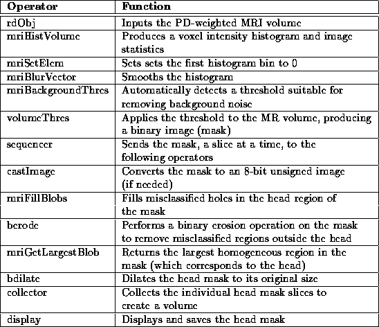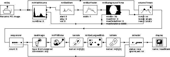 The Segment Head process uses histogram analysis to threshold automatically data from background noise in MR images. The WiT igraph for the process is shown in Figure 7.2. A brief description of each igraph operator is listed in Table 7.1.