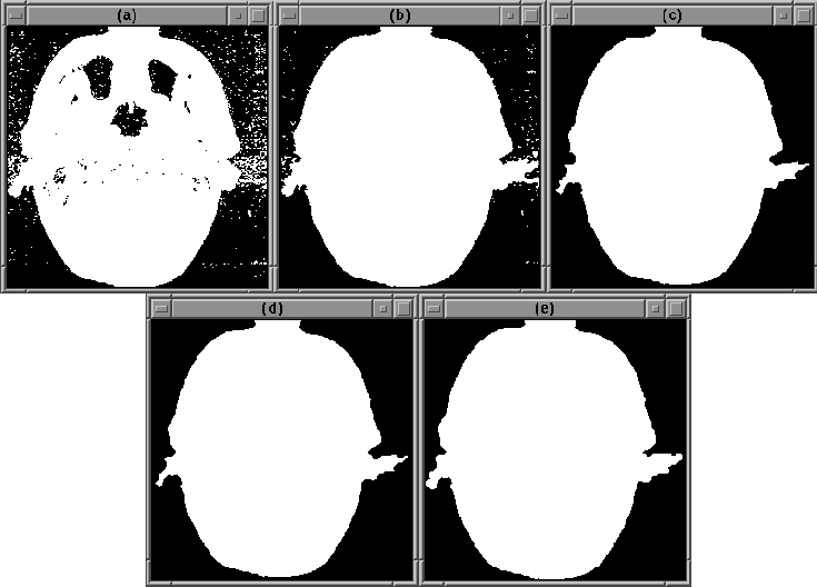 The sequence of operators following volumeThres in the Segment Head igraph create a head mask from the thresholded binary image by removing the background ``speckle'' and filling in misclassified regions in the area of the head. Figure 7.5 shows the image at each stage of noise removal. Complete results are presented in Chapter 8.