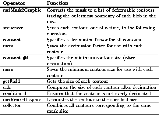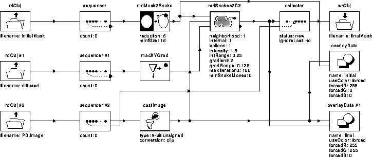 rdObj inputs the initial brain mask which is sent, slice by slice, to mriMask2Snake. mriMask2Snake converts each mask slice to a deformable contour for input into mriSnakes2D2. The igraph for mriMask2Snake is given in Figure 7.15. Its operator descriptions are listed in Table 7.6.