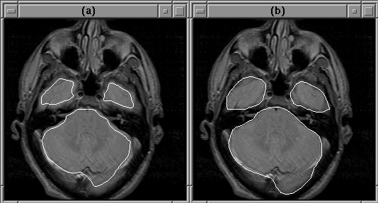 Given initial contours, mriSnakes2D2 uses the active contour model algorithm described in Chapter 5 to detect the intracranial boundary. It uses diffused T2-weighted slices for gradient information because they contain strong, gradual edges that stabilize the algorithm. PD-weighted slices are used for intensity information because, in these slices, tissue intensities inside the brain are relatively homogeneous and distinct from the surrounding tissue intensities. These characteristics inhibit the deformable contours from attaching themselves to physiological features within the brain and move the contours closer to the intracranial boundary.