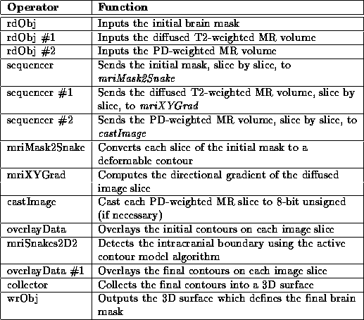 Note that the initial brain mask is imprecise. The active contour model algorithm, presented in Chapter 5, is used to refine the initial brain mask in a completely automatic process. The igraph implementing the process, Generate Final Brain Mask is shown in Figure 7.14. Brief descriptions of the igraph's operators are provided in Table 7.5. The igraph is discussed in more detail in the following sections.
