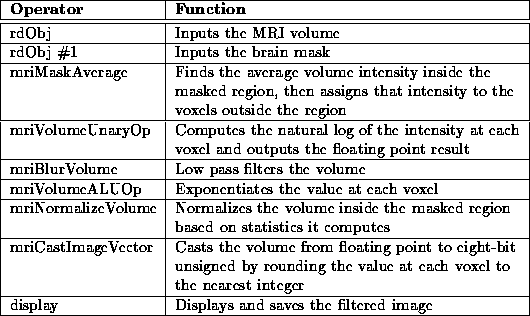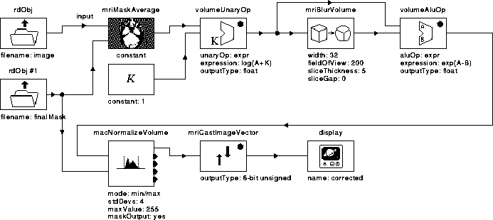 The Correct Intensity process uses the form of homomorphic filtering presented in Chapter 6 to reduce intensity variation due to RF inhomogeneity in MR image volumes. The WiT igraph for the process is given in Figure 7.18. The igraph operators are summarized in Table ~7.7.