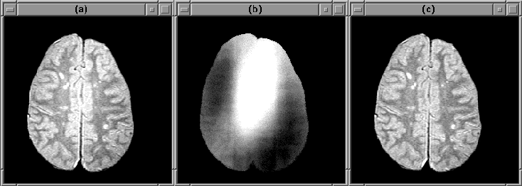 intensity correction and (c) after. (b) shows the RF inhomogeneity.
