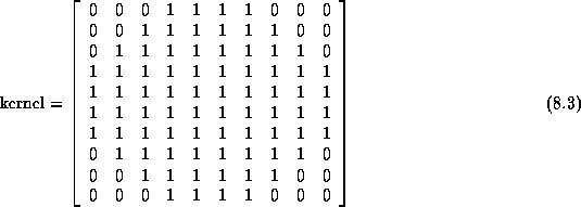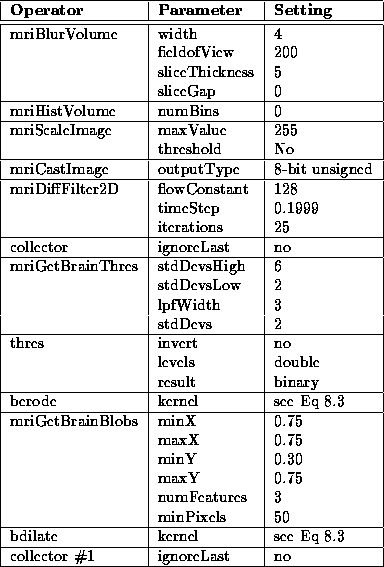 Results for the Generate Initial Brain Mask process are presented and discussed in this section. The process igraph uses similar parameters to produce initial brain masks for the data sets acquired by each scanner. These parameters are listed in Tables 8.5. Only the fieldOfView and sliceGap parameters of the mriBlurVolume operator differ to correspond with MRI acquisition parameters. In all cases, the kernel used by berode and bdilate is the following binary matrix: