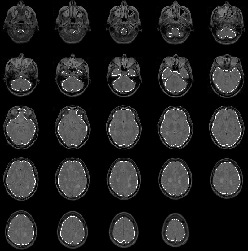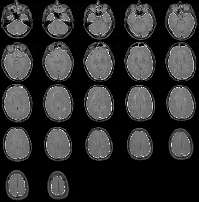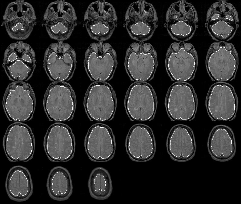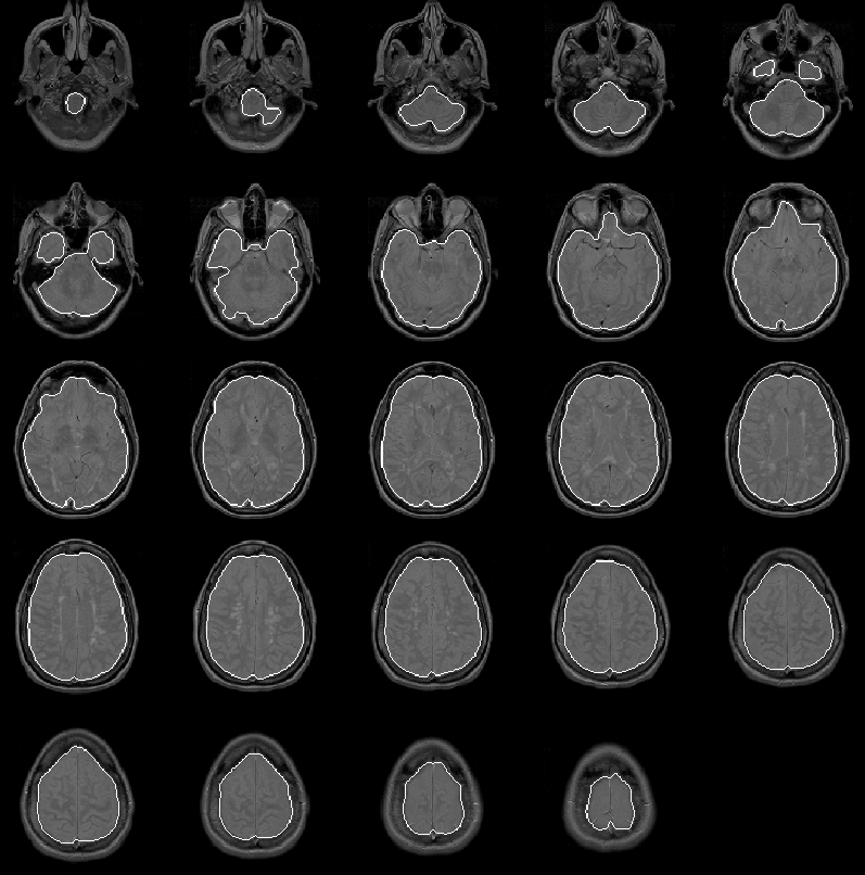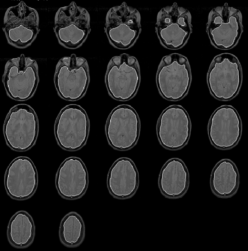 The mask apparently identifies all brain tissue regions. Its boundary falls consistently close to, and inside, the intracranial boundary. The initial brain mask should be an ideal seed for the Generate Final Brain Mask process which uses the active contour model algorithm with balloon forces to push the mask boundary outward.