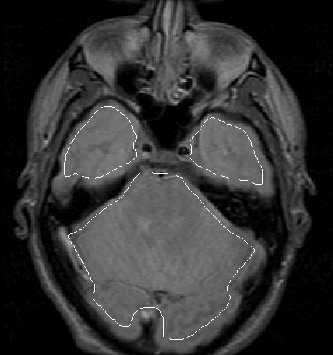 For Data Set 3 the Generate Initial Brain Mask process again produces a good initial brain mask to use as a seed for the Generate Final Brain Mask process. The mask is overlaid on the PD-weighted scan of Data Set 3 in Figure 8.14.