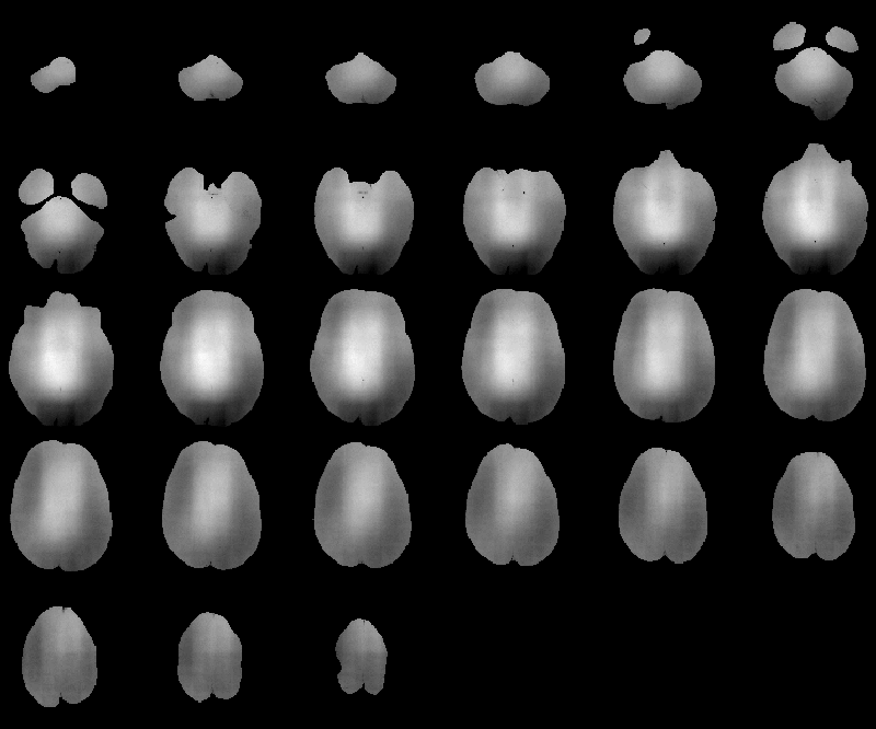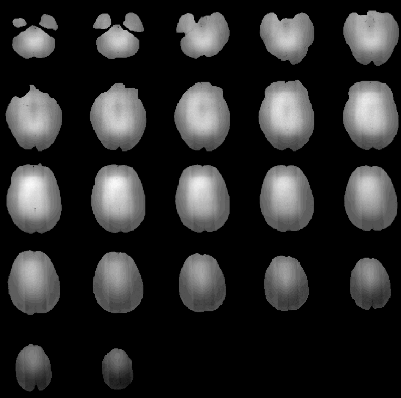 Figure 8.26 shows the RF inhomogeneity detected in Data Set 1 by the Correct Intensity process. Slice 16 of the PD-weighted volume, before and after intensity correction, is highlighted in Figure 8.27.