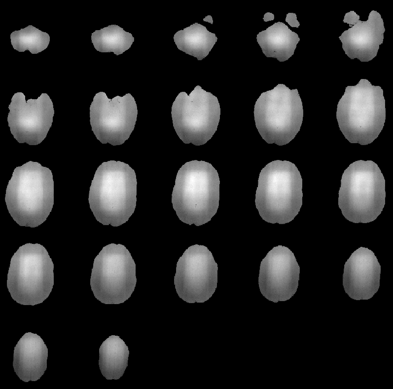 The RF inhomogeneity detected in Data Set 2 by the Correct Intensity process is displayed in Figure 8.29. Slice 16 is highlighted in Figure 8.30.