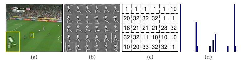 The following figure shows the processing pipeline of our method: (a) given a video sequence, (b) track and stabilize each human figure, (c) represent each frame by a ``motion word'', (d) ignore the ordering of words and represent the image sequences of a tracked person as a histogram over ``motion words''.